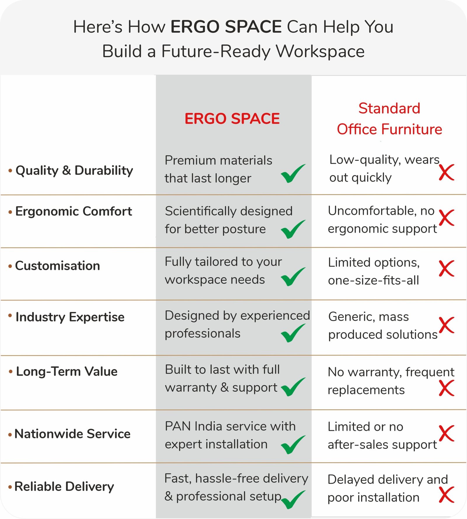 Yes! At ERGO SPACE, we specialise in providing fully customisable office furniture. From ergonomic office chairs to tailor-made corporate office tables, we work with you to design ergonomic desk setups, modular office furniture, and other solutions that perfectly match your office layout, branding, and functional needs.